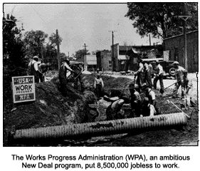 Through the National Industrial Recovery Act of 1933 the National Recovery Administration (NRA) came into being. The NRA attempted to revive industry by raising wages, reducing work hours and reining in unbridled competition. Portions of the NRA were ruled unconstitutional by the Supreme Court in 1935; however, the Works Progress Administration (WPA), which was the second part of the NRA, was allowed to stand. The majority of its collective bargaining stipulations survived in two subsequent bills. The NRA — a product of meetings among such “Brain Trust” advisors as Raymond Moley, big business leaders, and labor unionists — illustrated Roosevelt`s willingness to work with, rather than against, business interests.